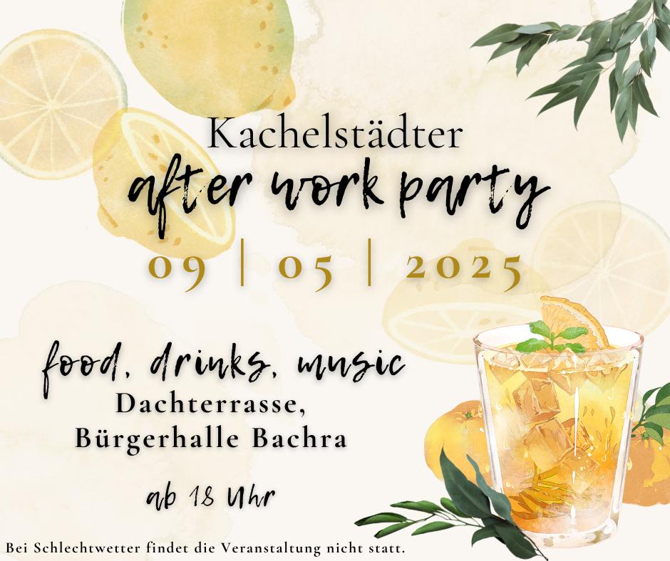 Schnapp dir deine Freunde und komm am 09. Mai 2025 auf die Dachterrasse der Bürgerhalle Bachra – zur Kachelstädter After Work Party!